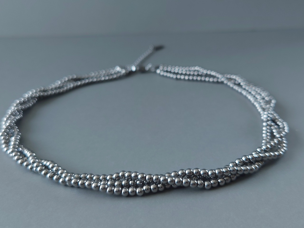 ステンレスラウンドビーズの魅力を余すことなく、たっぷり3連に仕上げたネックレス