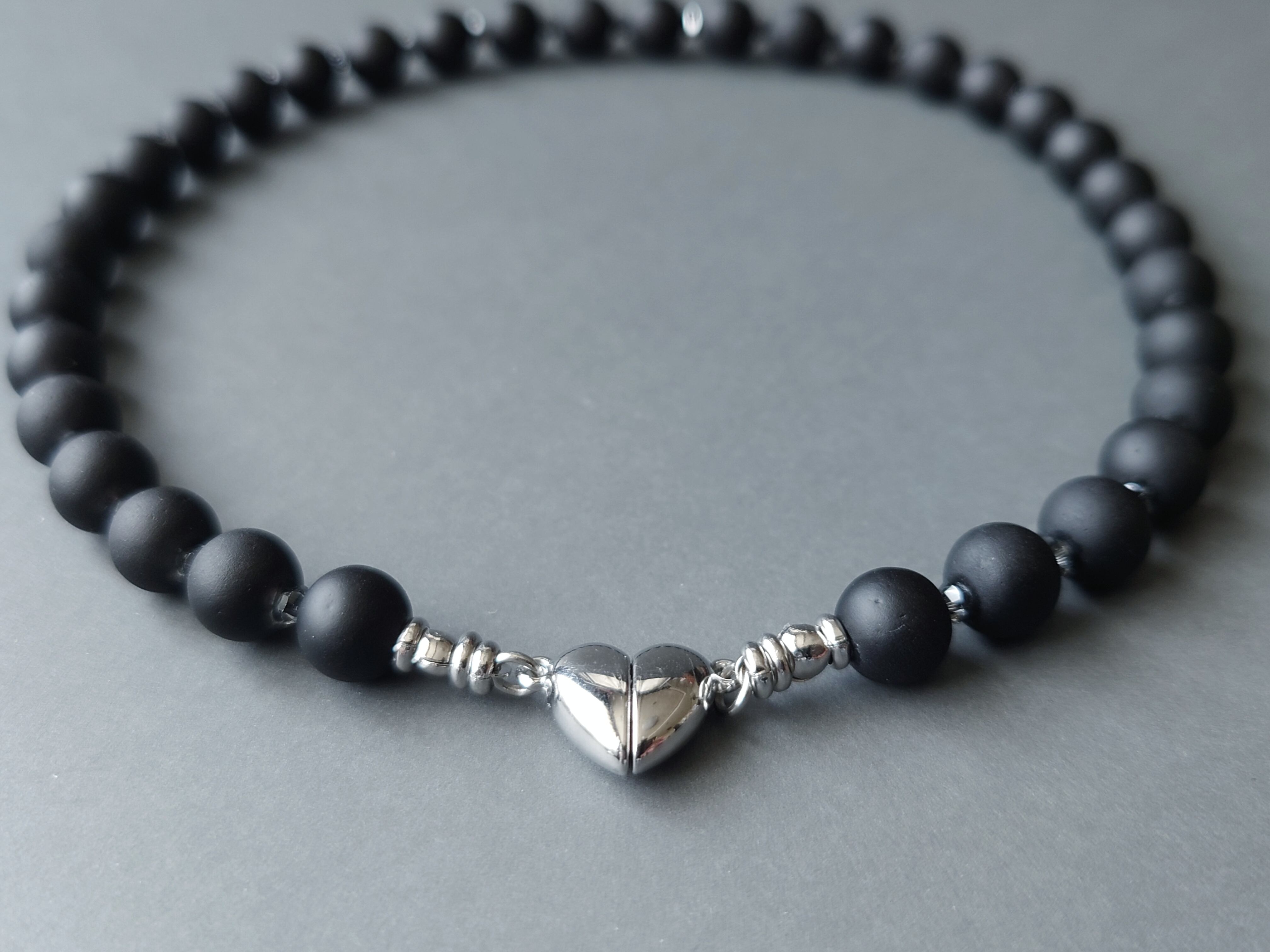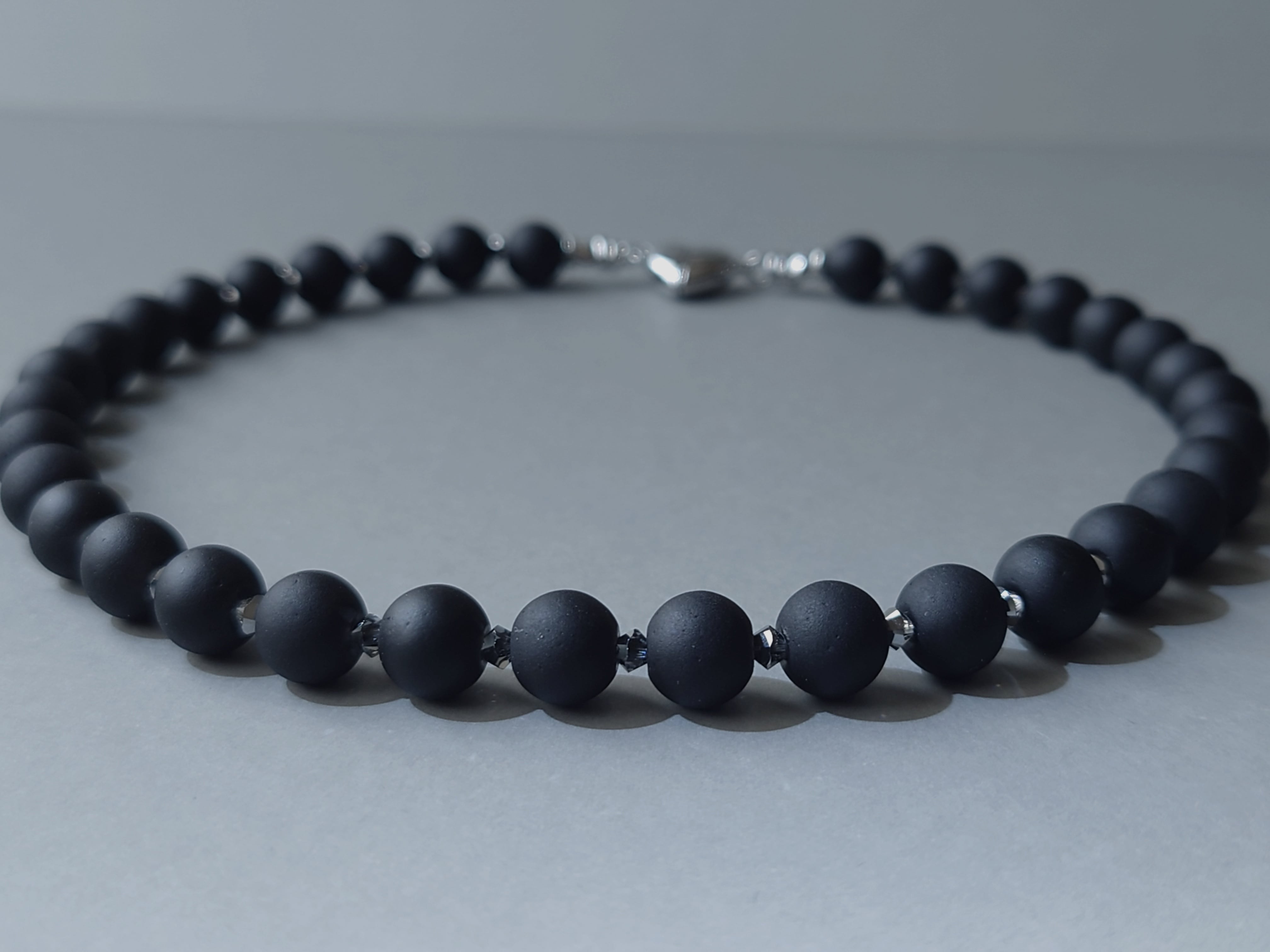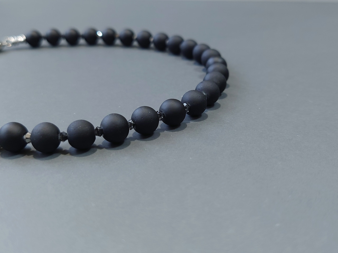 マットなブラックビーズを繋ぐのは、小さなクリスタルビーズ