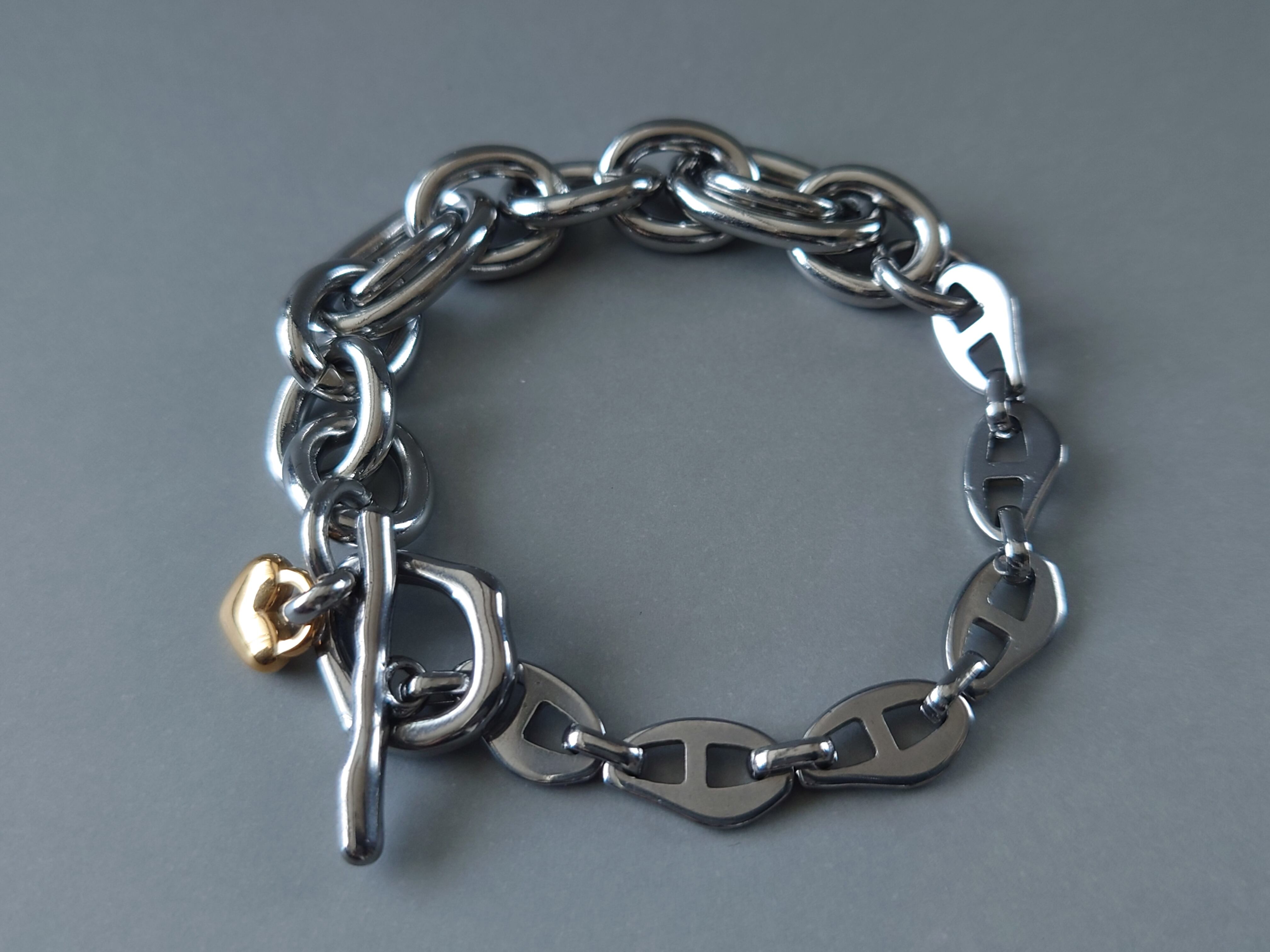 インパクトのあるチェーンとシャープなフォルムのチェーンを組み合わせ、ポイントは小さなゴールドのモチーフ