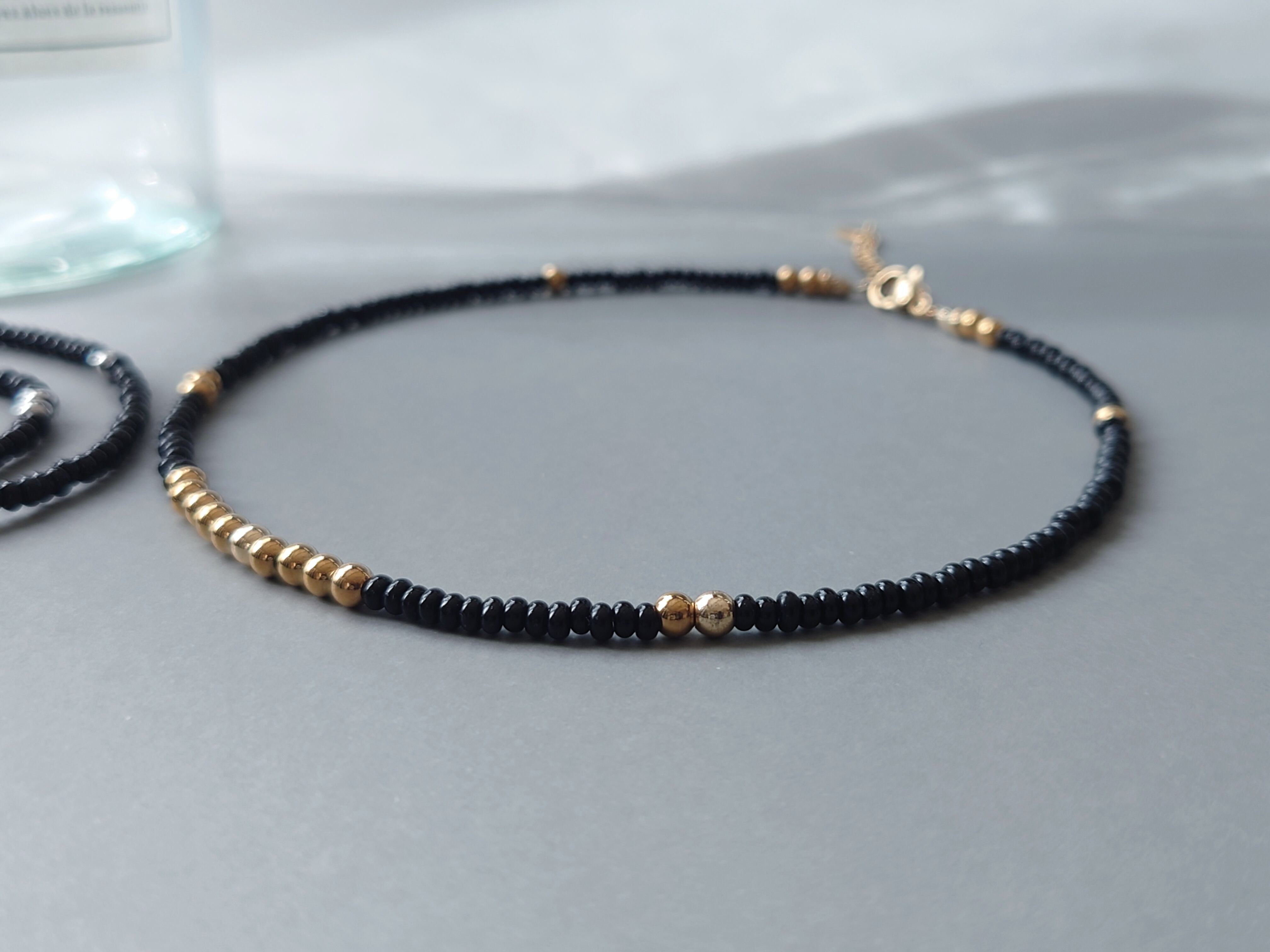 小さなブラックビーズをベースに、メタリックなシルバーとゴールドをアクセントにした、チョーカータイプのコンパクトネックレス