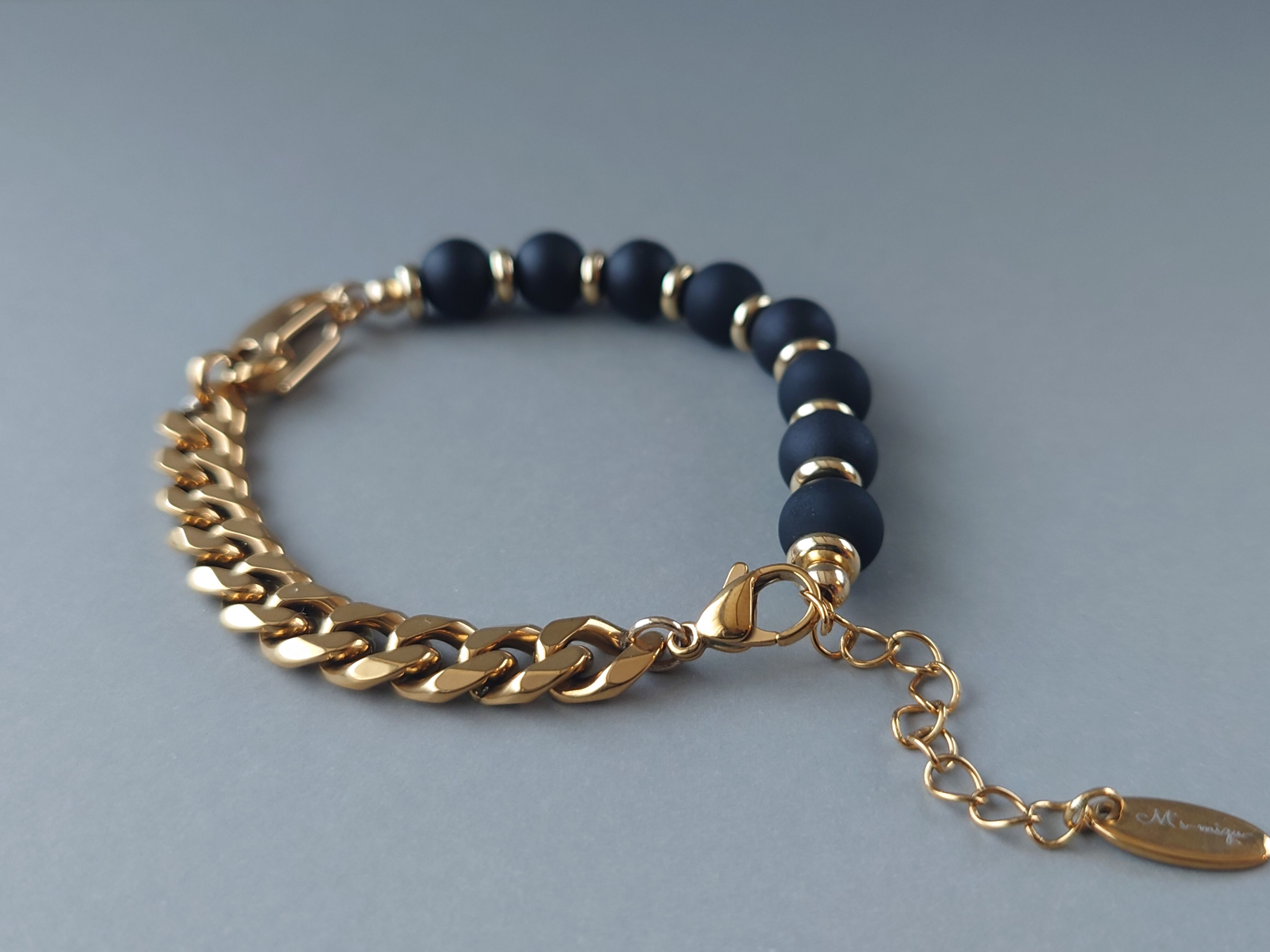 マットなブラックビーズとゴールドチェーンのブレスレット