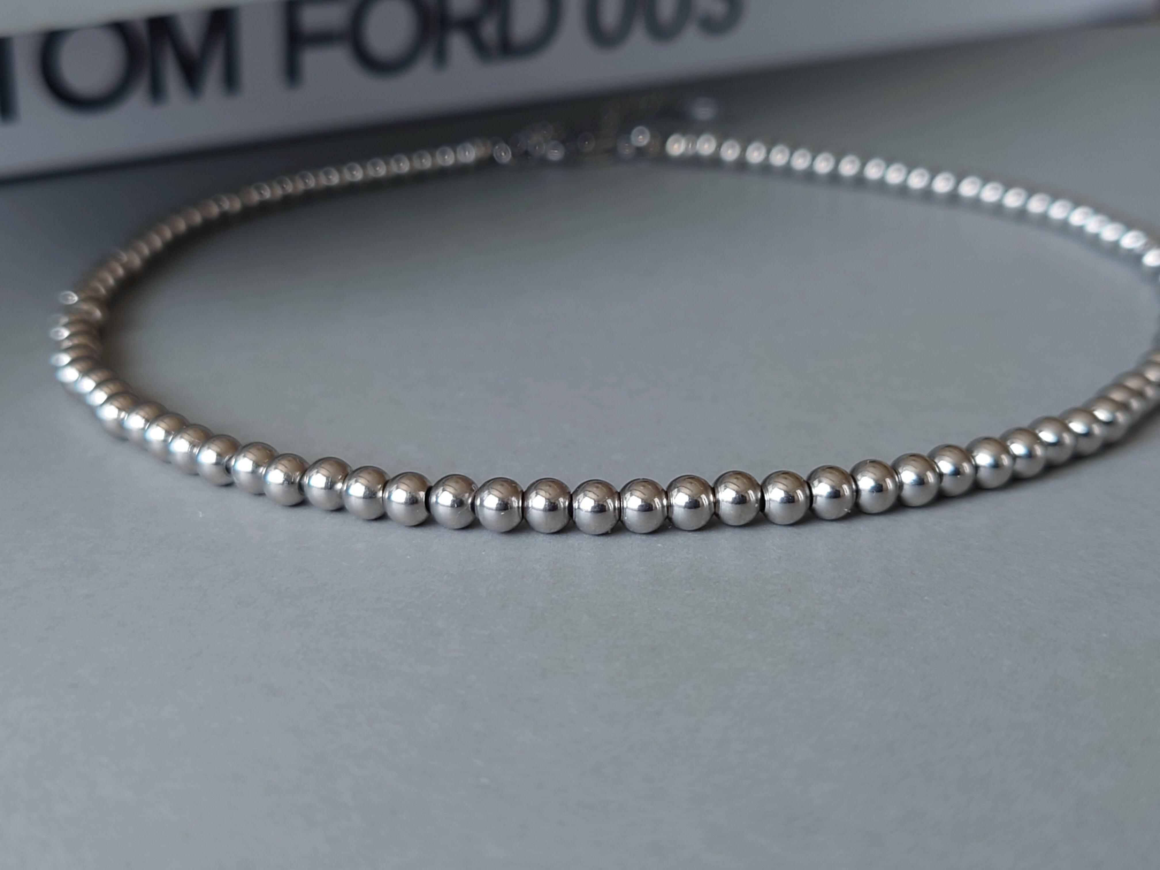 似た形のボールチェーンとは印象が異なり、様々なアクセサリーとの相性が良く、長さや印象の異なるネックレスとレイヤードしていただくと、より完成度の高いコーディネートになります
